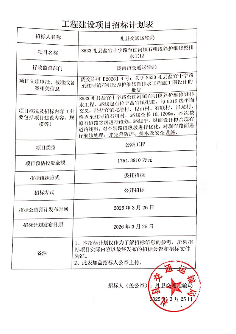 S533禮縣鹽官十字路至紅河鎮(zhèn)石咀段養(yǎng)護(hù)維修暨排水工程