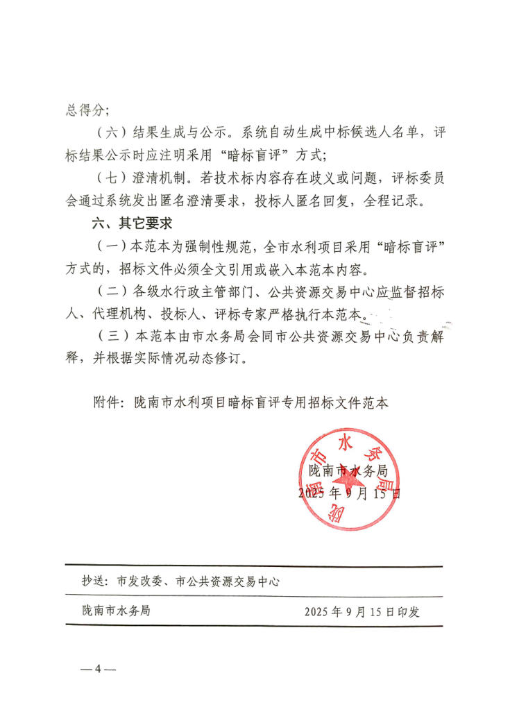 附件:附件:隴南市水利項目盲標(biāo)暗評專用招標(biāo)文件范本(1).pdf 附件:水利類-材料采購模板.docx 附件:水利類-監(jiān)理模板.docx 附件:水利類-設(shè)計模板.docx 附件:水利類-施工模板.docx